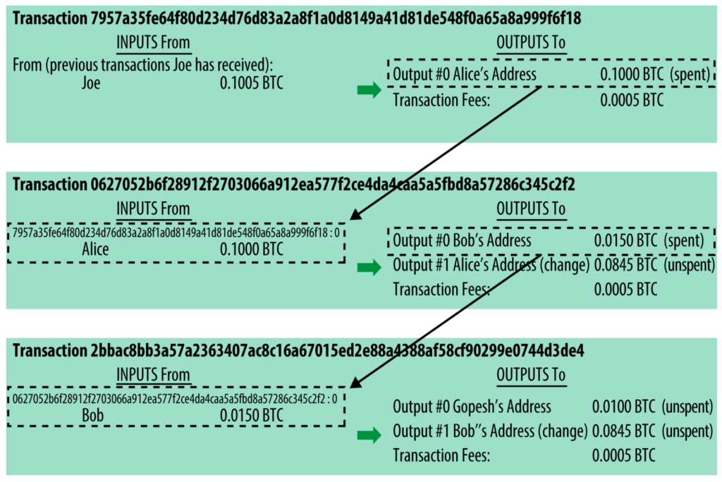 Los resultados de una transacción se pueden utilizar como entradas para otra transacción. Esto crea una cadena de propiedad a medida que el valor de bitcoin se mueve de una dirección a otra.